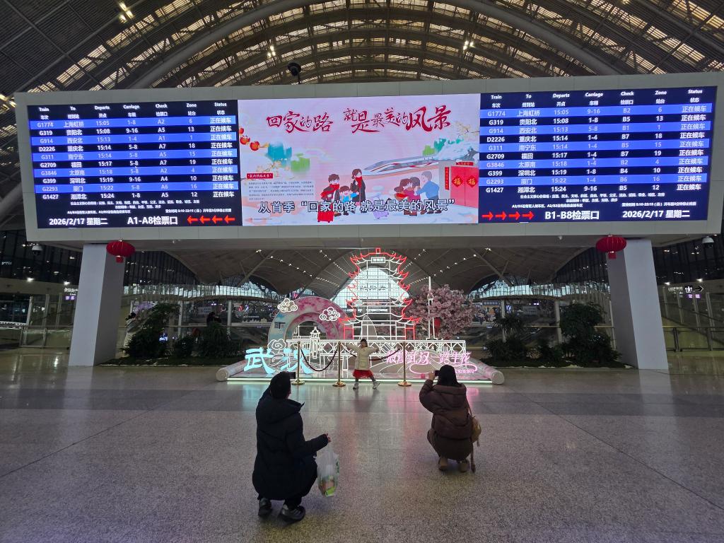 2月17日,高鐵武漢站內(nèi),父母給小朋友拍照。新華社記者汪平 攝