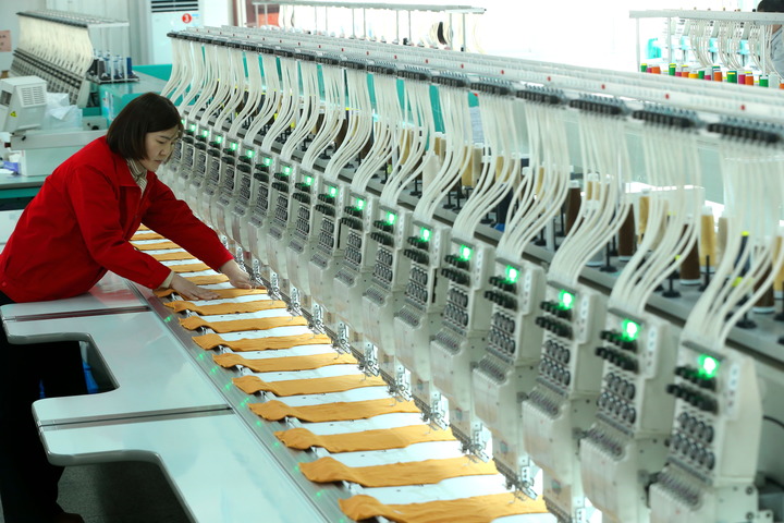 2月22日,山東省青島市即墨區(qū)即發(fā)集團(tuán)有限公司的工人在繡花生產(chǎn)線上忙碌。新華社發(fā)(梁孝鵬 攝)