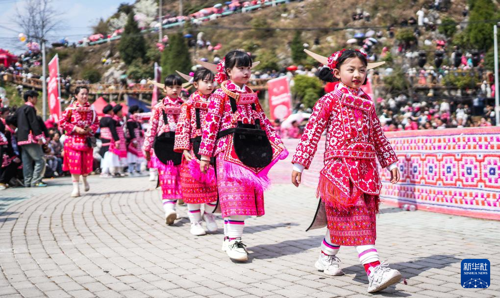 2月26日,在貴州省六盤水市六枝特區(qū)梭戛苗族彝族回族鄉(xiāng)高興村跳花場(chǎng),小朋友們?cè)谶M(jìn)行巡游。