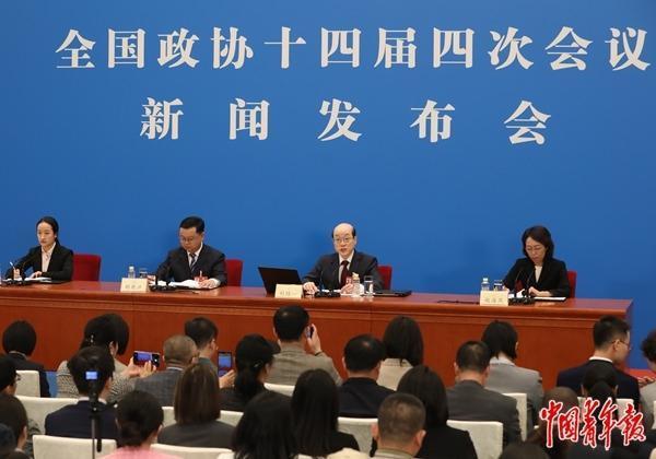 3月3日,北京,全國政協(xié)十四屆四次會(huì)議新聞發(fā)布會(huì)在人民大會(huì)堂一層新聞發(fā)布廳舉行。大會(huì)新聞發(fā)言人劉結(jié)一(右二)向中外媒體介紹本次大會(huì)有關(guān)情況并回答記者提問。中青報(bào)·中青網(wǎng)記者 陳劍/攝
