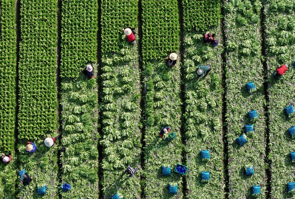 2026年2月24日,農(nóng)民在四川彭州市九尺鎮(zhèn)玉源社區(qū)的田地里采收油麥菜(無人機(jī)照片)。新華社發(fā)(羅國楊 攝)
