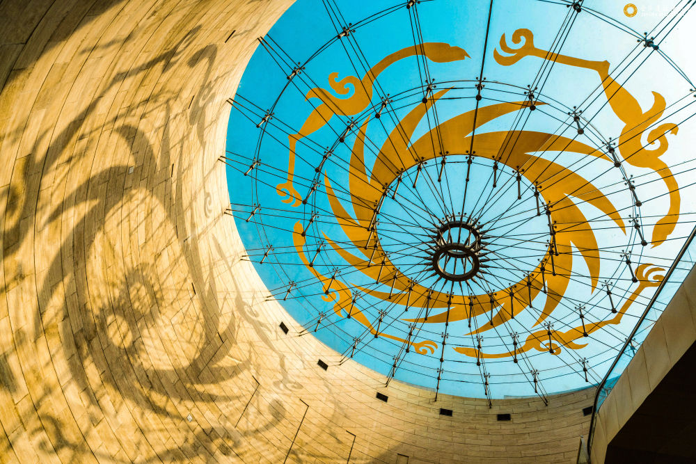 這是陽(yáng)光透過(guò)成都金沙遺址博物館陳列館穹頂,在墻壁上投下太陽(yáng)神鳥造型的影子(2022年3月10日攝)。新華社發(fā)(張艷攝)