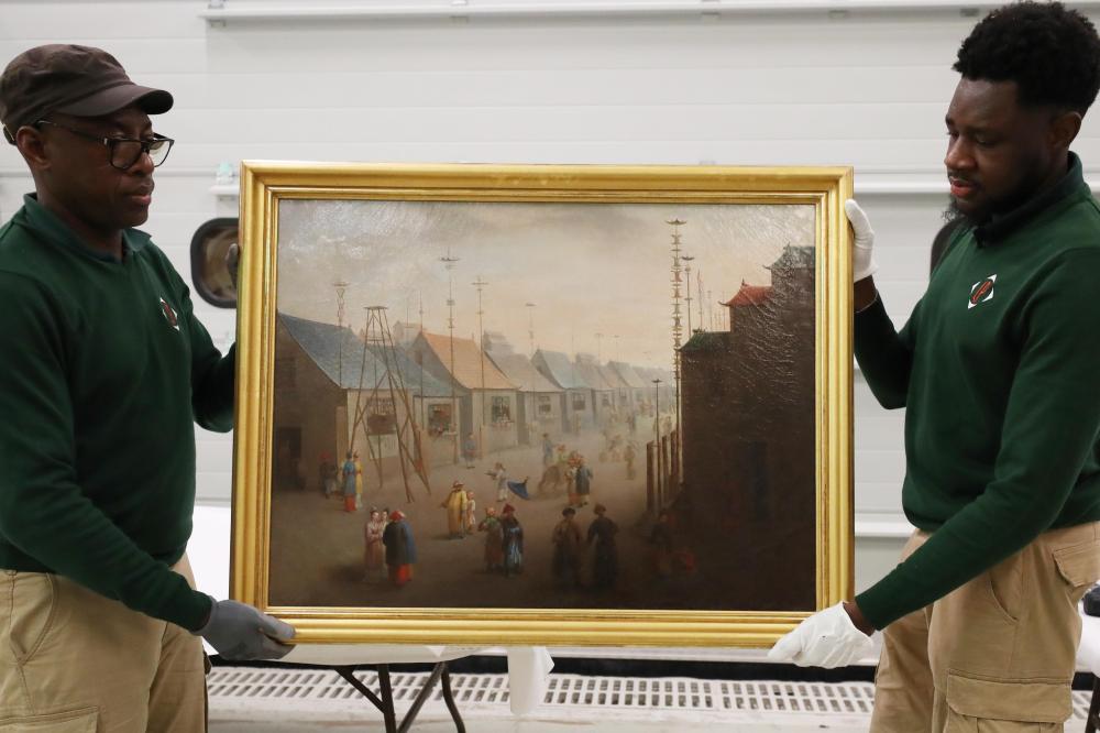 3月11日,在法國(guó)巴黎近郊的凡爾賽宮,工作人員準(zhǔn)備打包油畫《南京的集市》。在2024年中法建交60周年暨中法文化旅游年之際,凡爾賽宮和故宮博物院將于4月至6月在故宮共同舉辦“凡爾賽宮與紫禁城”展覽。新華社記者高靜攝