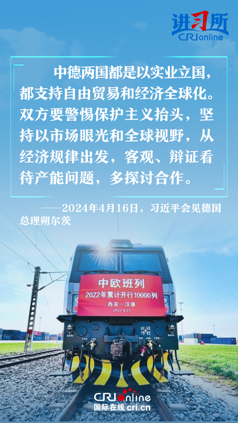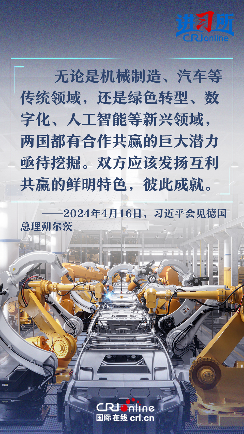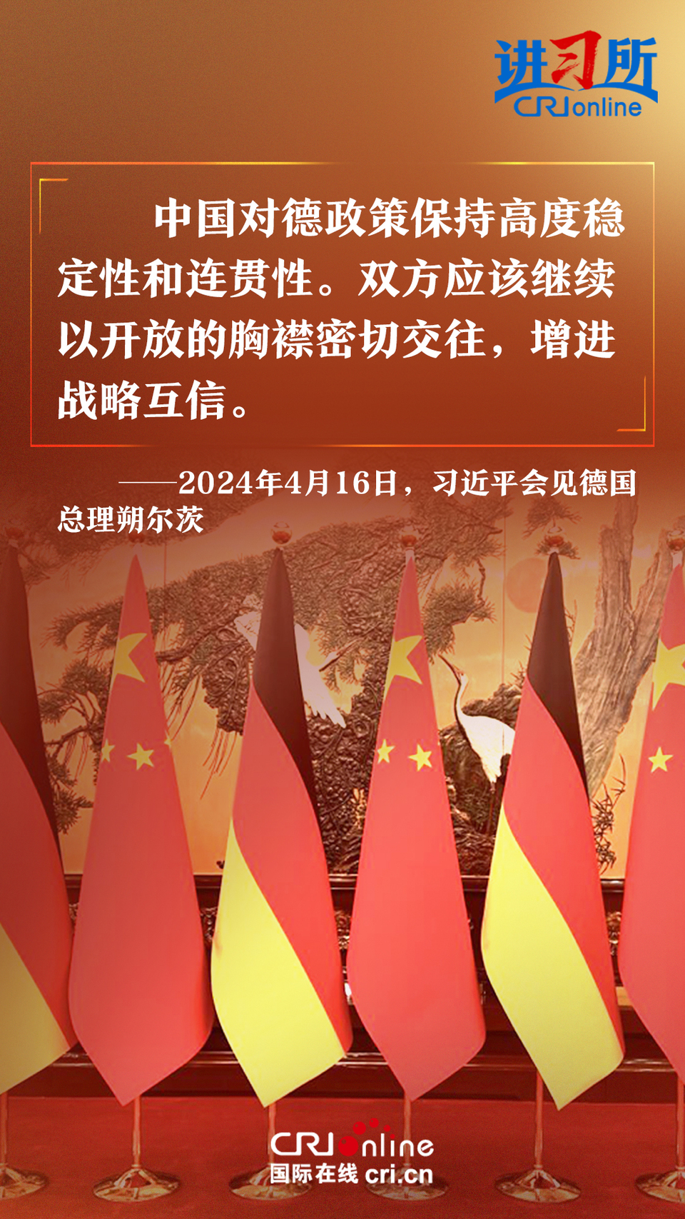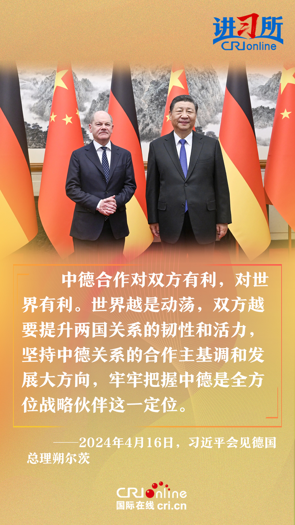 4月16日上午,中國國家主席習近平在北京釣魚臺國賓館會見了德國總理朔爾茨。習近平指出,中德合作對雙方有利,對世界有利。世界越是動蕩,雙方越要提升兩國關(guān)系的韌性和活力。中德是世界第二、第三大經(jīng)濟體,鞏固和發(fā)展中德關(guān)系的意義超越雙邊關(guān)系范疇,對亞歐大陸乃至整個世界都有重要影響。兩國要從長遠和戰(zhàn)略角度看待和發(fā)展雙邊關(guān)系,攜手為世界注入更多穩(wěn)定性和確定性。