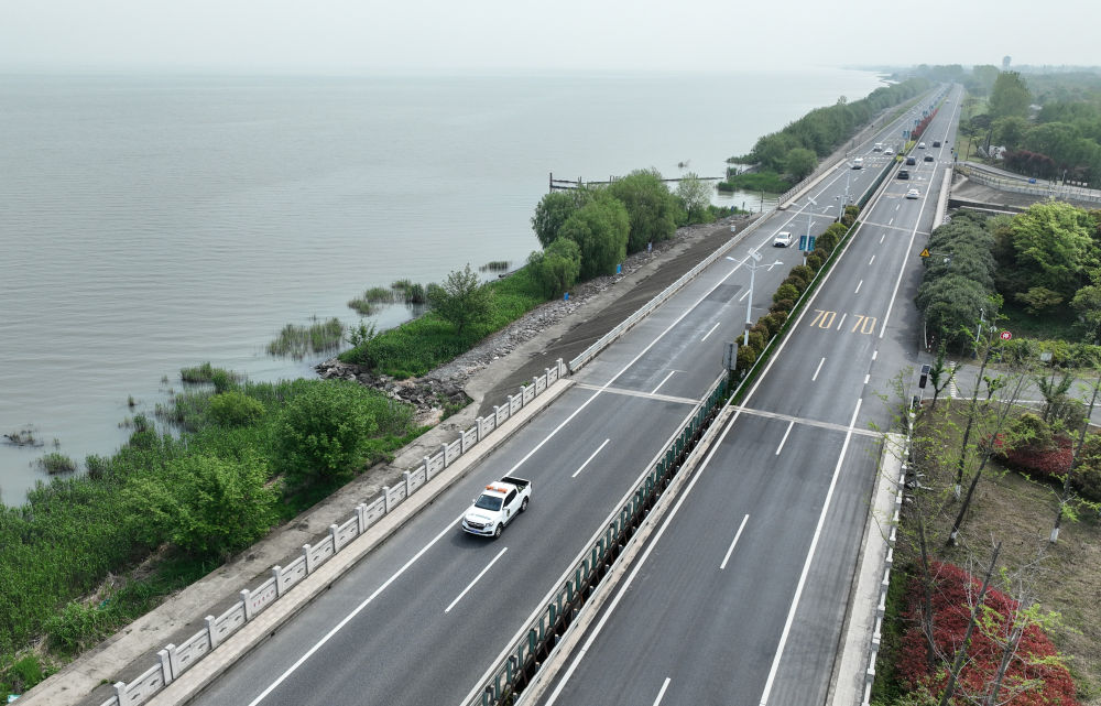2024年4月11日,浙江省湖州市吳興區(qū)綜合行政執(zhí)法局高新區(qū)中隊(duì)執(zhí)法人員駕車在太湖沿岸巡查 (無(wú)人機(jī)照片)。