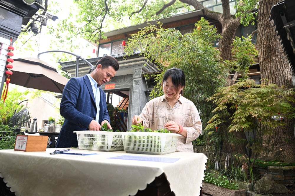 2024年4月11日,在江蘇省蘇州市吳中區(qū)金庭鎮(zhèn),退捕漁民沈雪榮和妻子沈燕燕在自家經(jīng)營(yíng)的農(nóng)家樂“美味漁家蟹園”擇菜。“退捕后,太湖的生態(tài)環(huán)境越來(lái)越好,游客越來(lái)越多,我們家的農(nóng)家樂生意也越來(lái)越紅火?!鄙蜓s感慨道。
