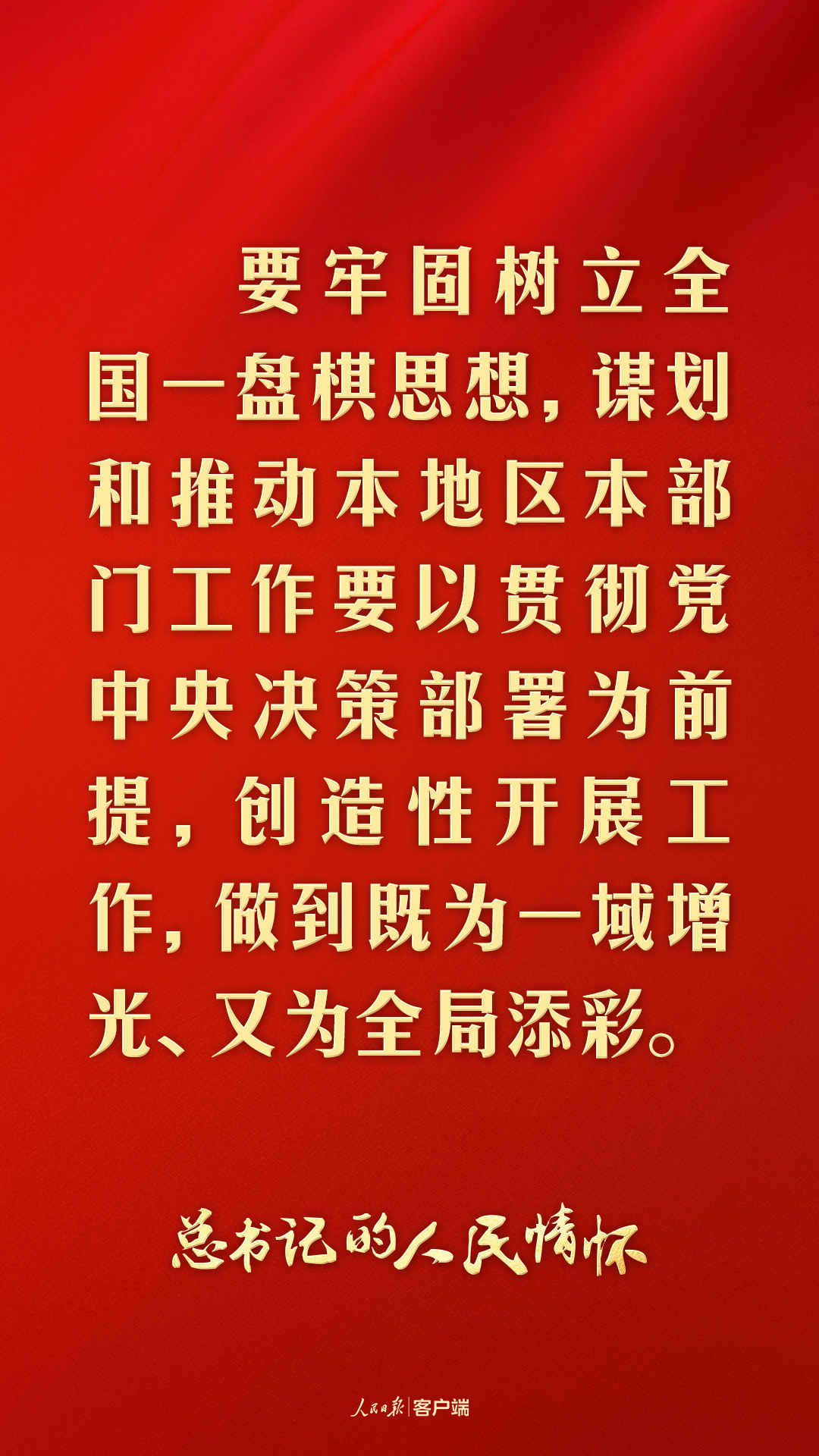 “要牢固樹立全國一盤棋思想,謀劃和推動(dòng)本地區(qū)本部門工作要以貫徹黨中央決策部署為前提,創(chuàng)造性開展工作,做到既為一域增光、又為全局添彩。”