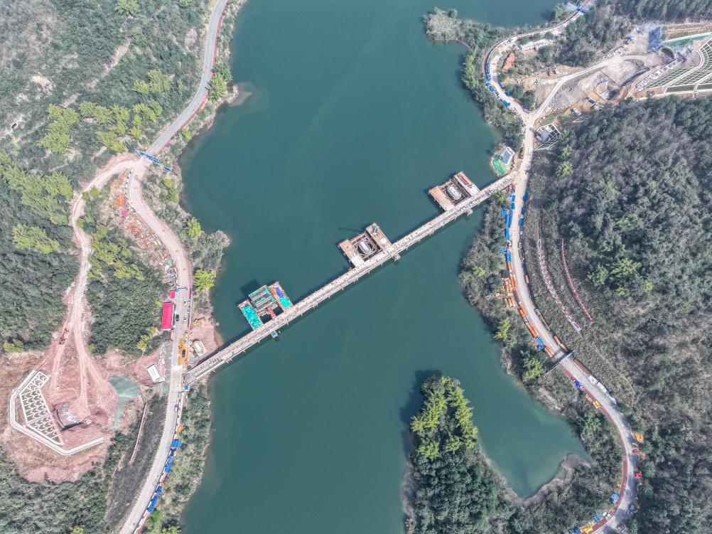 這是2月19日拍攝的位于重慶市銅梁區(qū)的成渝中線高鐵玄天湖大橋建設現(xiàn)場(無人機照片)。新華社記者 唐奕 攝