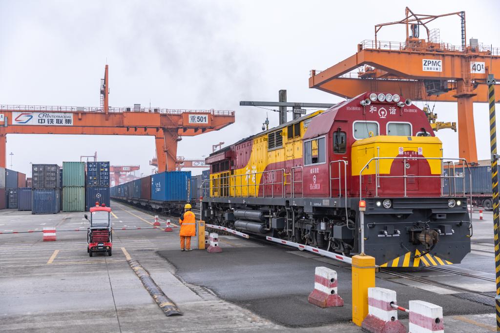 3月7日,一列滿載機械設備、整車及零部件等貨物的中歐班列在重慶團結(jié)村中心站等候發(fā)車。 新華社記者 黃偉 攝