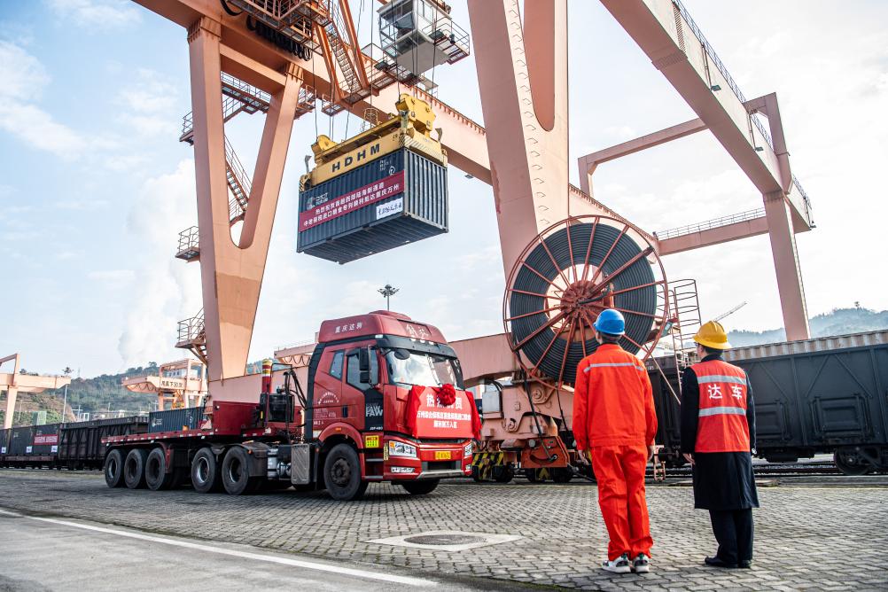 1月4日,在重慶萬州新田港站,工作人員進行集裝箱吊裝作業(yè),將專列貨物轉(zhuǎn)運至公路物流環(huán)節(jié)。 新華社記者 唐奕 攝