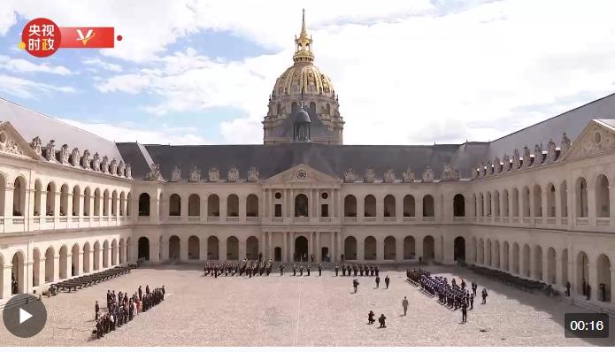 當?shù)貢r間5月6日下午,在馬克龍陪同下,習近平檢閱法蘭西共和國衛(wèi)隊和陸??杖妰x仗隊。