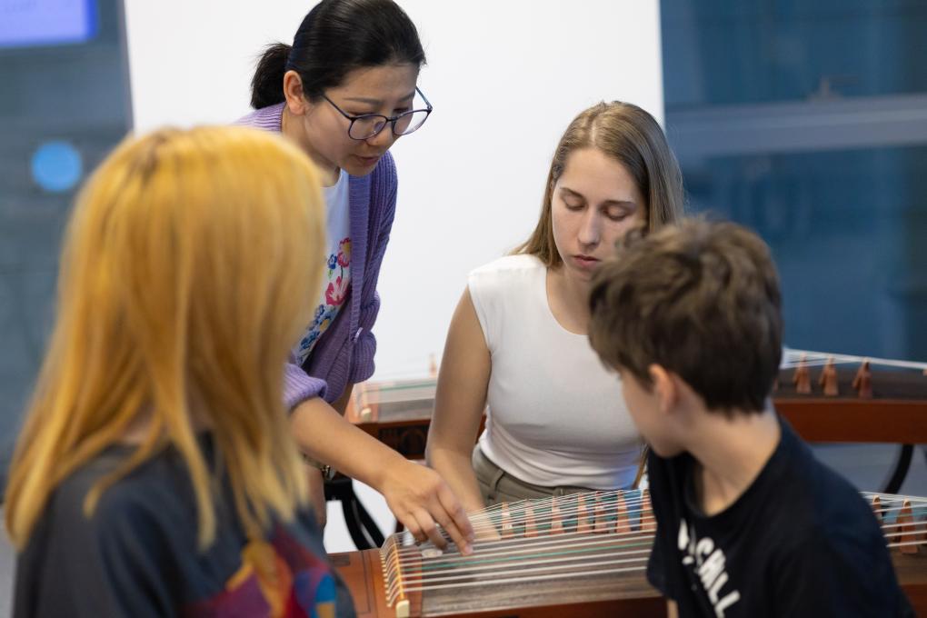 2024年4月29日,在塞爾維亞貝爾格萊德中國文化中心,古箏指導(dǎo)老師王宣(后左)在教學(xué)。新華社記者李京攝