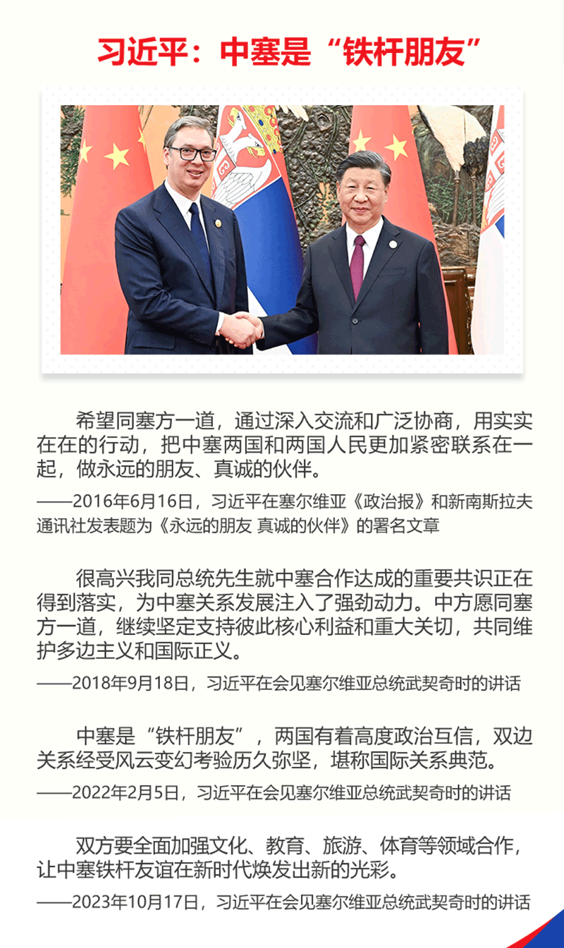 這是時(shí)隔近八年,習(xí)主席再次對(duì)塞爾維亞進(jìn)行國(guó)事訪問(wèn)。中塞是“鐵桿朋友”,習(xí)主席指出,希望同塞方一道,通過(guò)深入交流和廣泛協(xié)商,用實(shí)實(shí)在在的行動(dòng),把中塞兩國(guó)和兩國(guó)人民更加緊密聯(lián)系在一起,做永遠(yuǎn)的朋友、真誠(chéng)的伙伴。