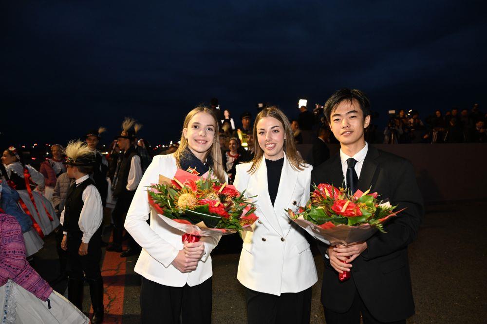 當(dāng)?shù)貢r(shí)間5月8日晚,在匈牙利布達(dá)佩斯國際機(jī)場(chǎng),匈牙利姑娘歐拉·塔瑪拉(中)與匈中雙語學(xué)校兩名參加歡迎儀式的學(xué)生合影。