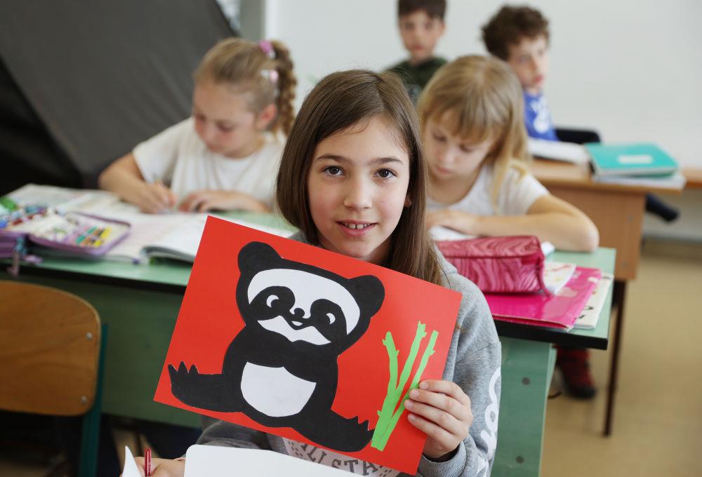 2024年5月3日,匈中雙語學(xué)校三年級(jí)學(xué)生寶怡展示自己的大熊貓形象美術(shù)作品。