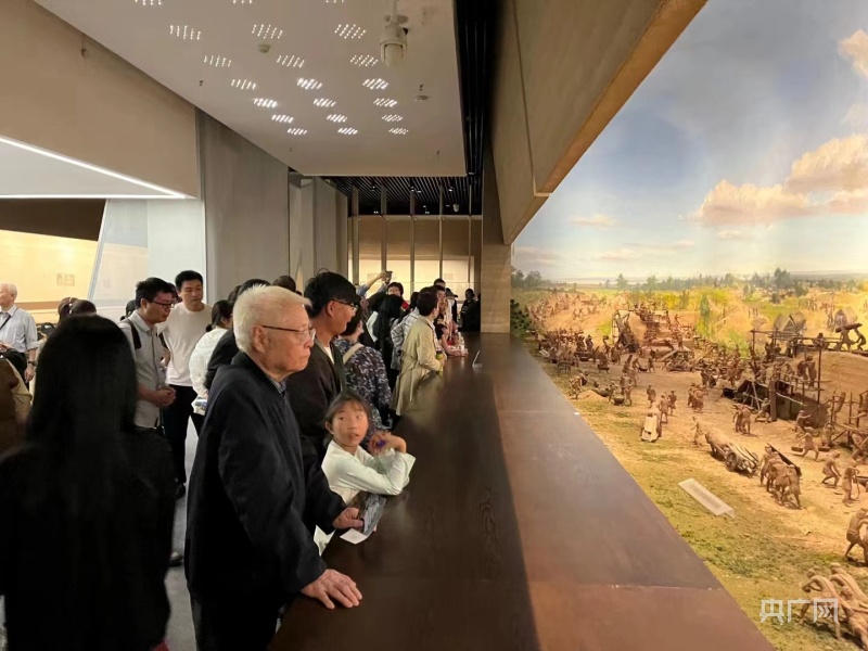 游客在鄭州商代都城遺址博物院觀看筑城場景復原(央廣網(wǎng)發(fā) 馬玉鵬 攝)