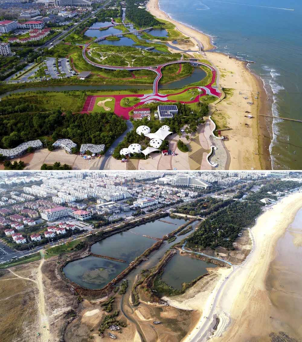 這是一張拼版照片,上圖為2021年拍攝的生態(tài)修復(fù)完成后的山東日照市陽(yáng)光海岸綠道,該綠道長(zhǎng)28公里(無(wú)人機(jī)照片);下圖為2019年11月拍攝的日照市陽(yáng)光海岸綠道未經(jīng)生態(tài)修復(fù)時(shí)的樣子。新華社記者 郭緒雷 攝