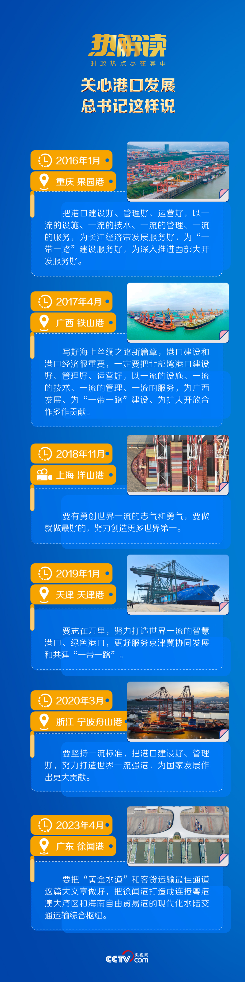 總書記曾深刻指出:“經(jīng)濟(jì)強(qiáng)國(guó)必定是海洋強(qiáng)國(guó)、航運(yùn)強(qiáng)國(guó)?!彼M覈?guó)港口建設(shè)“要志在萬里”,“為國(guó)家發(fā)展作出更大貢獻(xiàn)”。