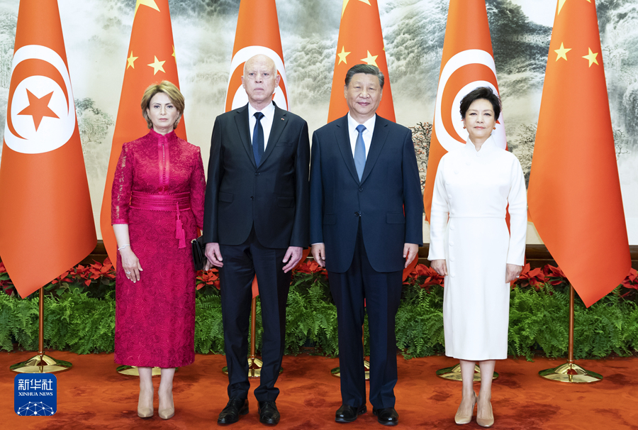 5月31日上午,國(guó)家主席習(xí)近平在北京人民大會(huì)堂同來(lái)華國(guó)事訪問(wèn)并出席中國(guó)-阿拉伯國(guó)家合作論壇第十屆部長(zhǎng)級(jí)會(huì)議開(kāi)幕式的突尼斯總統(tǒng)賽義德舉行會(huì)談。這是會(huì)談前,習(xí)近平和夫人彭麗媛同賽義德和夫人伊什拉芙合影。新華社記者 黃敬文 攝