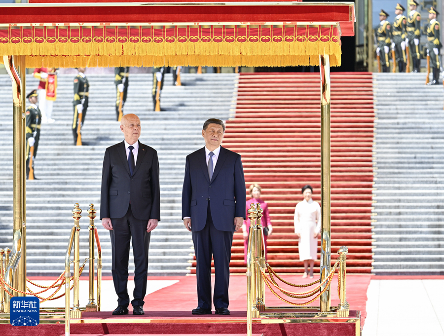 5月31日上午,國(guó)家主席習(xí)近平在北京人民大會(huì)堂同來(lái)華國(guó)事訪問(wèn)并出席中國(guó)-阿拉伯國(guó)家合作論壇第十屆部長(zhǎng)級(jí)會(huì)議開(kāi)幕式的突尼斯總統(tǒng)賽義德舉行會(huì)談。這是會(huì)談前,習(xí)近平在人民大會(huì)堂東門外廣場(chǎng)為賽義德舉行歡迎儀式。新華社記者 黃敬文 攝