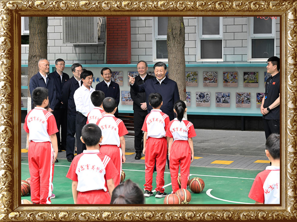 2023年5月31日上午,習近平總書記來到北京育英學校看望慰問師生,在籃球場同正在上體育課的小學生們親切交流。習近平親切地說:“現(xiàn)在生活條件好了,孩子們不是要吃得胖胖的,而是要長得壯壯的、練得棒棒的?!?/strong>