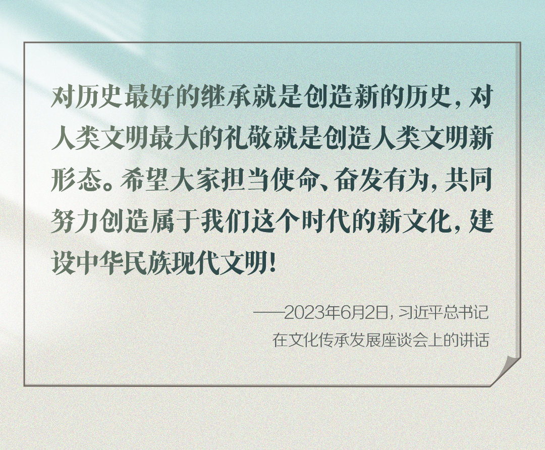 2023年6月2日,習近平總書記在文化傳承發(fā)展座談會上強調(diào):“在新的起點上繼續(xù)推動文化繁榮、建設文化強國、建設中華民族現(xiàn)代文明,是我們在新時代新的文化使命。”