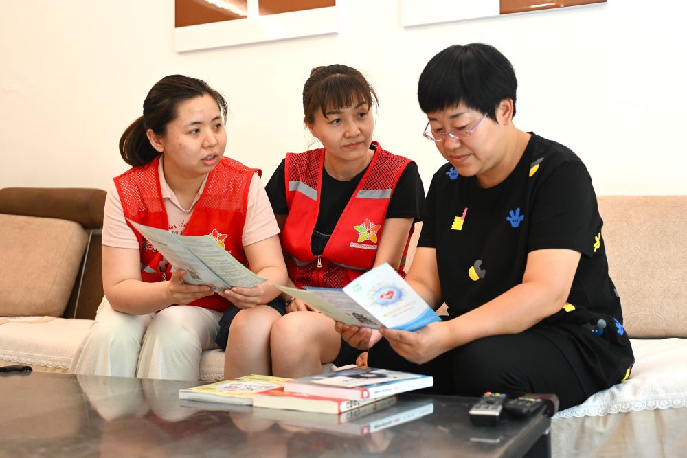 6月20日,寧夏銀川市金鳳區(qū)長(zhǎng)城花園社區(qū)志愿者在入戶(hù)為居民提供服務(wù)。