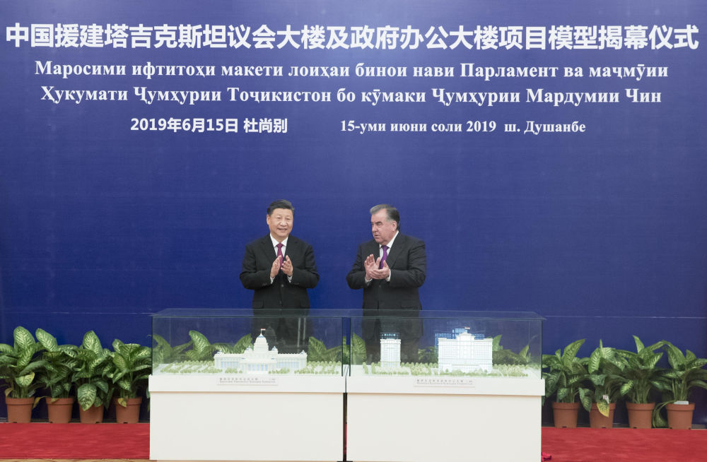 時光回到五年前,2019年6月15日,國家主席習(xí)近平在杜尚別同塔吉克斯坦總統(tǒng)拉赫蒙會談。會談后,兩國元首共同出席中方援塔議會大樓、政府辦公大樓項目模型揭幕儀式。