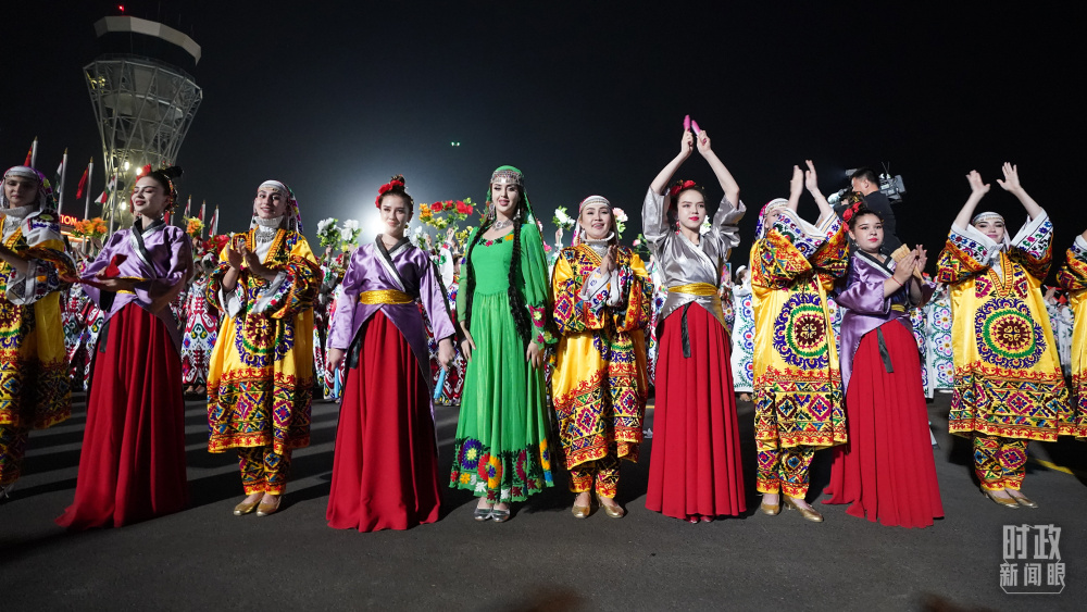 1500多名身著民族盛裝的塔吉克斯坦青年,表演富有濃郁特色的中塔歌舞,揮舞中塔兩國國旗,表達(dá)對中國領(lǐng)導(dǎo)人的熱烈歡迎。