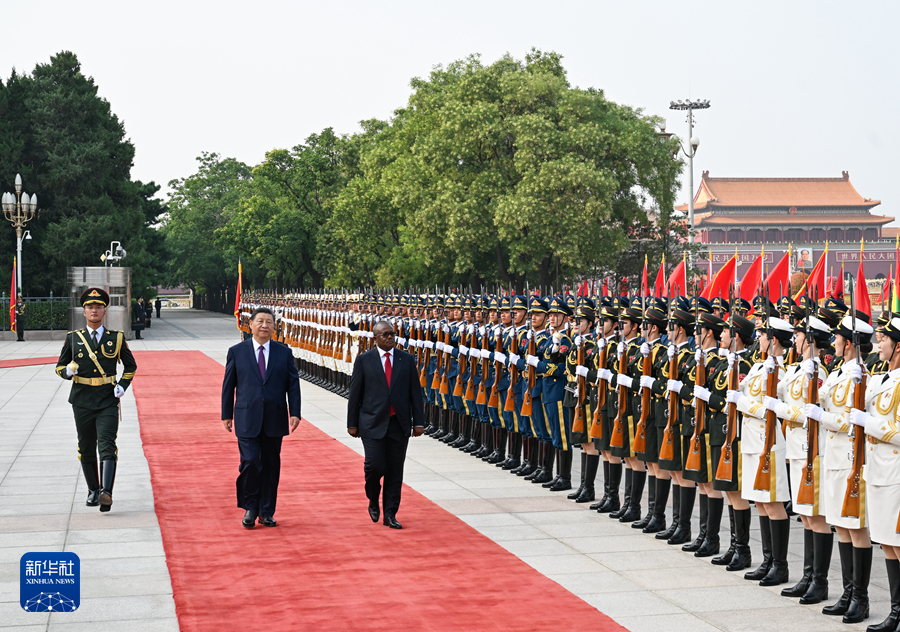 恩巴洛抵達(dá)時,禮兵列隊致敬。兩國元首登上檢閱臺,軍樂團(tuán)奏中國和幾內(nèi)亞比紹兩國國歌,天安門廣場鳴放21響禮炮。恩巴洛在習(xí)近平陪同下檢閱中國人民解放軍儀仗隊,并觀看分列式。