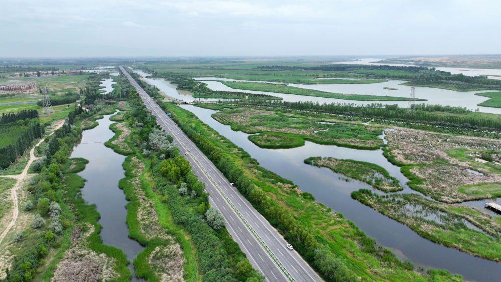 這是2024年6月13日拍攝的黃河寧夏段濱河大道(無人機(jī)照片)。近年來,寧夏努力建設(shè)黃河流域生態(tài)保護(hù)和高質(zhì)量發(fā)展先行區(qū),全力打好黃河保護(hù)持久戰(zhàn)。新華社記者 王鵬 攝