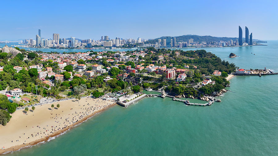 游人在廈門鼓浪嶼沙灘上游玩(無人機照片)。新華社記者 姜克紅 攝