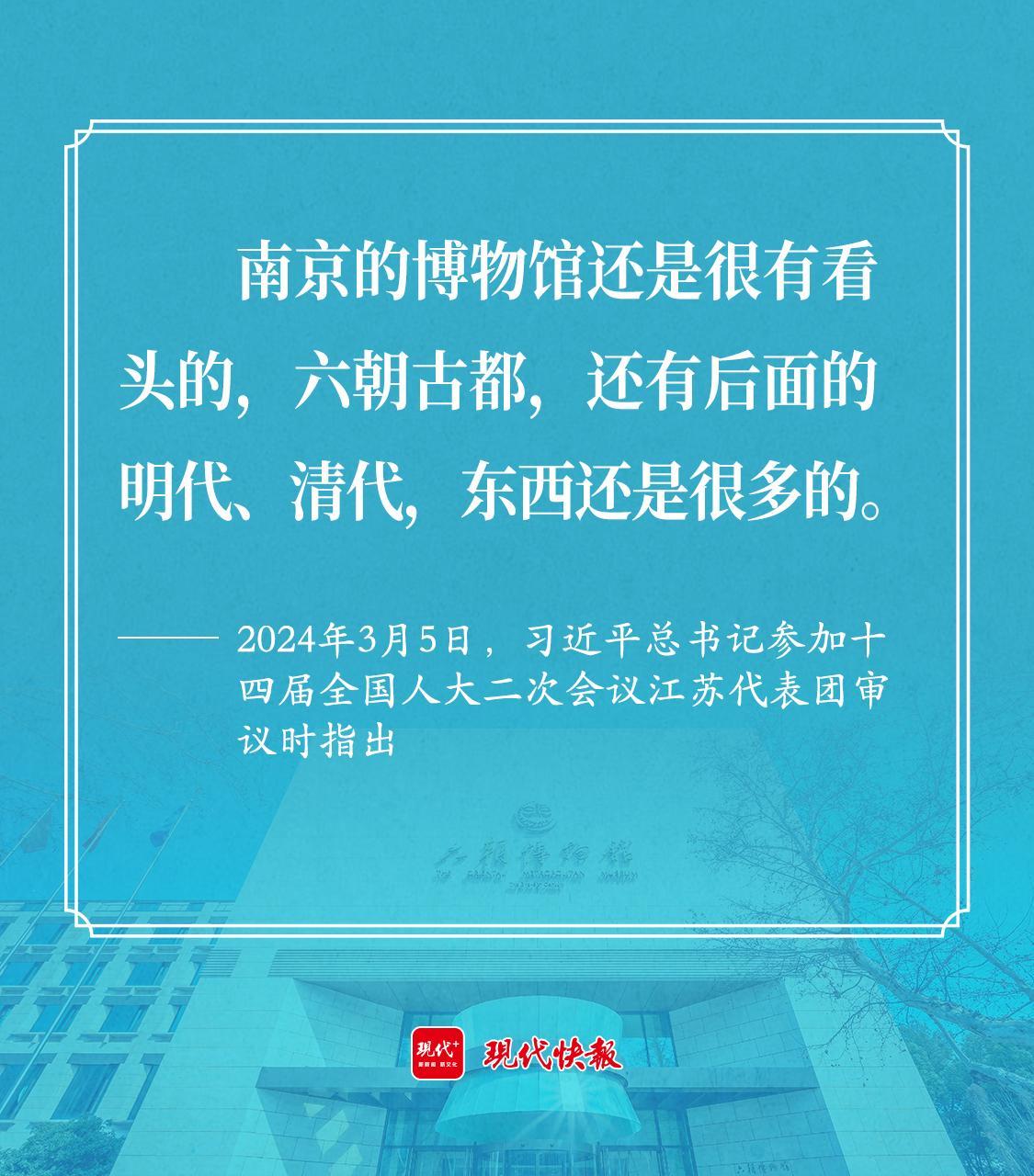 2024年3月5日,習(xí)近平總書記參加十四屆全國人大二次會議江蘇代表團(tuán)審議??倳浽诼犕昴暇┦胁┪锟傪^副館長宋燕代表講述后表示,“南京的博物館還是很有看頭的,六朝古都,還有后面的明代、清代,東西還是很多的?!?/p>