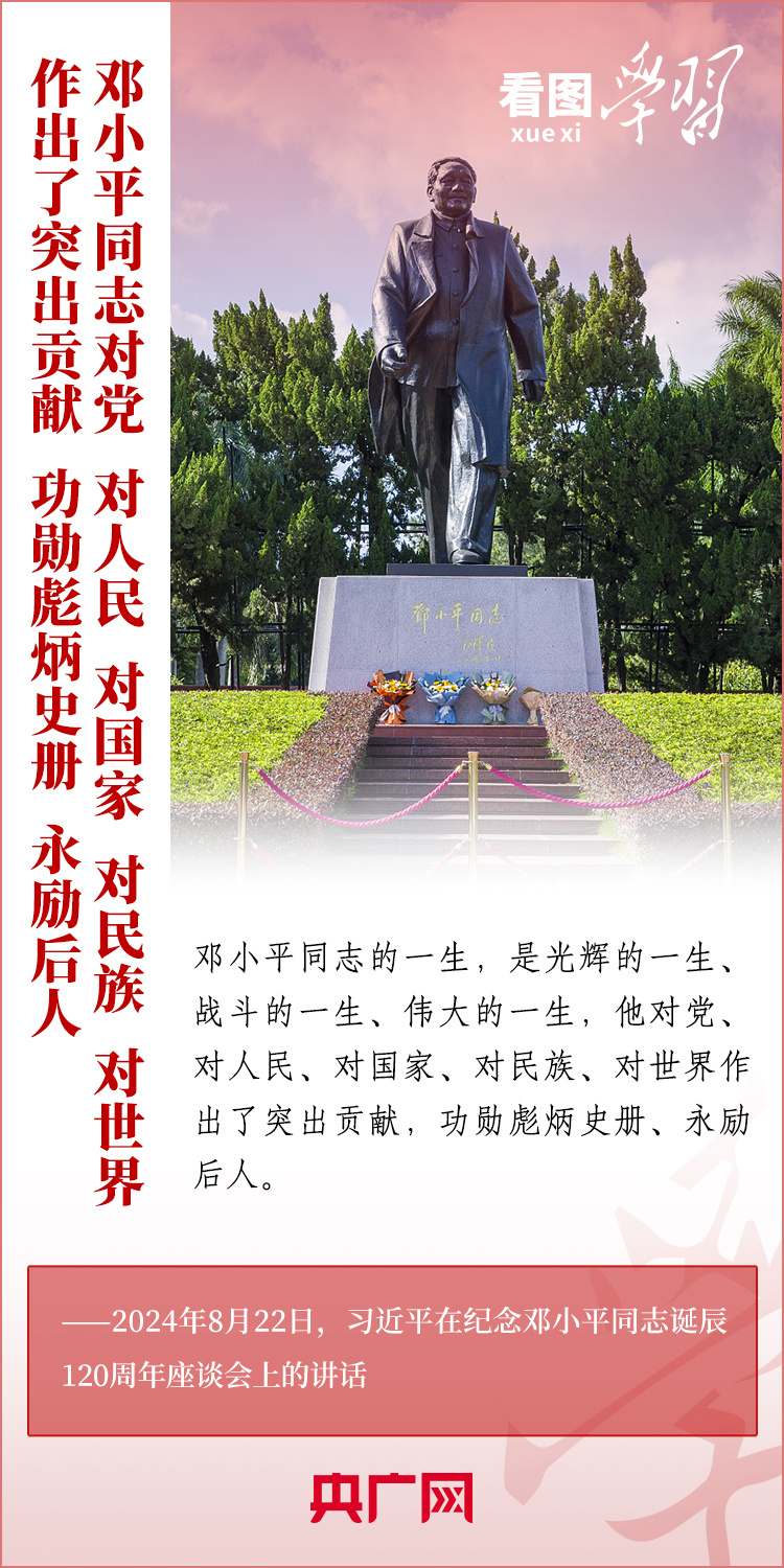 8月22日,習近平總書記在紀念鄧小平同志誕辰120周年座談會上發(fā)表重要講話指出,鄧小平同志的歷史功勛是全方位的、開創(chuàng)性的,對中國和世界的影響是深刻的、長遠的??倳洀娬{,對鄧小平同志最好的紀念,就是把他開創(chuàng)的中國特色社會主義事業(yè)繼續(xù)推向前進。我們要緊緊圍繞以中國式現代化全面推進強國建設、民族復興偉業(yè)這個中心任務,繼往開來,奮發(fā)進取。一起來學習!
