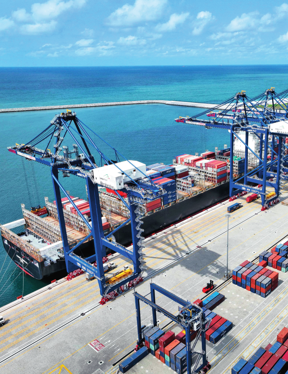 由中國港灣工程有限責任公司承建的尼日利亞萊基深水港位于中尼合作建設的拉各斯萊基自貿區(qū)內,是尼日利亞首個現(xiàn)代化深水港和最大港口。圖為一艘貨輪在尼日利亞拉各斯萊基深水港裝卸集裝箱(2024 年 3 月 11 日攝)萊基港公司供圖