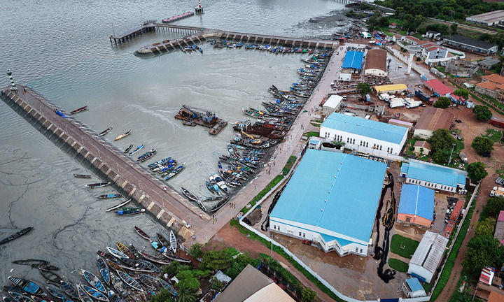 這是2024年7月8日在幾內(nèi)亞比紹首都比紹拍攝的板丁漁業(yè)碼頭和中企投建的水產(chǎn)品加工存儲(chǔ)綜合設(shè)施(右側(cè)藍(lán)頂建筑區(qū)域)(無人機(jī)照片)。新華社記者 韓旭 攝