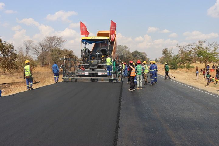 2024年8月27日,在馬拉維恩科塔科塔,施工人員在卡帕滕加至本加公路升級改造項(xiàng)目路段鋪筑瀝青路面。新華社發(fā)