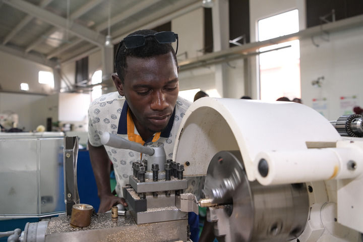 2023年1月10日,在加蓬首都利伯維爾的恩考克經(jīng)濟(jì)特區(qū),恩考克國際職業(yè)教育和培訓(xùn)中心(由中國航空技術(shù)國際控股有限公司聯(lián)合成都航空職業(yè)技術(shù)學(xué)院等院校共建)的學(xué)生進(jìn)行車削加工操作訓(xùn)練。新華社記者 韓旭 攝
