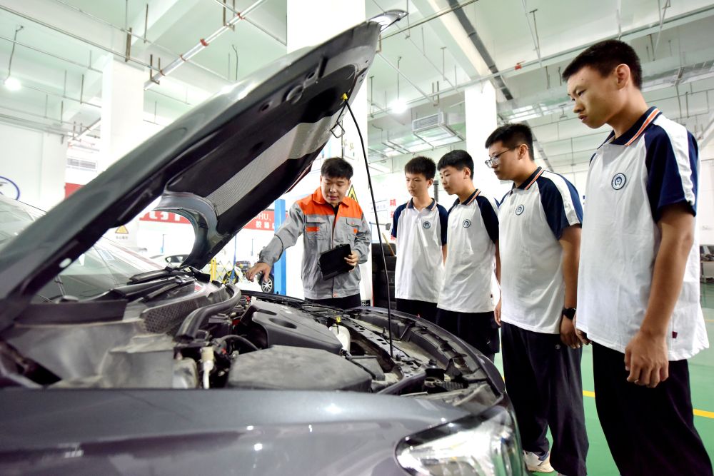 2024年6月7日,河北省邢臺市威縣職業(yè)技術(shù)教育中心教師在指導(dǎo)學(xué)生學(xué)習(xí)汽車維修技術(shù)。新華社記者 王曉 攝