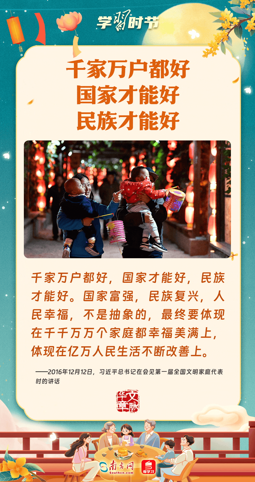 明月寄相思,家國總關(guān)情。作為中華優(yōu)秀傳統(tǒng)文化的重要載體之一,中秋節(jié)不但寄托著海內(nèi)外華人對闔家團圓的美好期許,還承載著深厚的故鄉(xiāng)情、家國情。習(xí)近平總書記曾在多個場合深刻闡述個人、家庭與國家之間的關(guān)系,強調(diào)要厚植家國情懷,把實現(xiàn)個人夢、家庭夢融入國家夢、民族夢之中。中秋佳節(jié),讓我們一起回顧總書記那些經(jīng)典話語,共同感受他至深至厚的家國情懷。