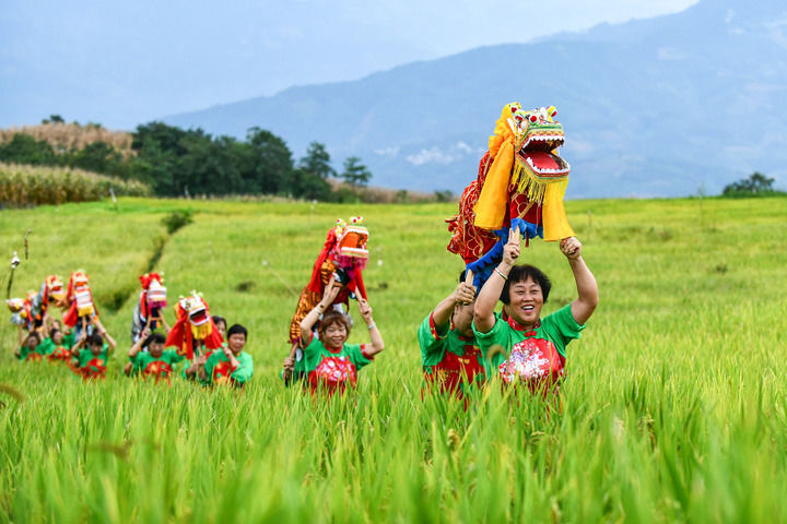 在云南省紅河哈尼族彝族自治州個舊市卡房鎮(zhèn)的旱地優(yōu)質(zhì)稻種植示范區(qū),群眾抬著板凳龍在田間穿行迎接豐收季的到來(2024年9月20日攝)。新華社記者 王靜頤 攝