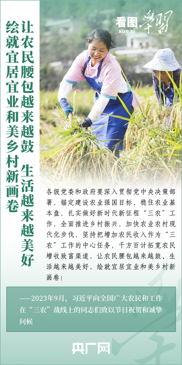 民族要復興,鄉(xiāng)村必振興。黨的十八大以來,每到各地考察調研,習近平總書記總會去農村看一看,走進田間地頭,和農民拉拉家常??倳洀娬{,“建設宜居宜業(yè)和美鄉(xiāng)村是農業(yè)強國的應有之義”,“要讓農民腰包越來越鼓、生活越來越美好”。