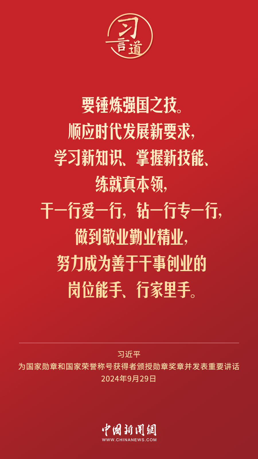 經(jīng)中共中央批準(zhǔn),中華人民共和國國家勛章和國家榮譽稱號頒授儀式于9月29日上午10時在人民大會堂隆重舉行。中共中央總書記、國家主席、中央軍委主席習(xí)近平向國家勛章和國家榮譽稱號獲得者分別授予“共和國勛章”“友誼勛章”和國家榮譽稱號獎?wù)虏l(fā)表重要講話。習(xí)近平指出——