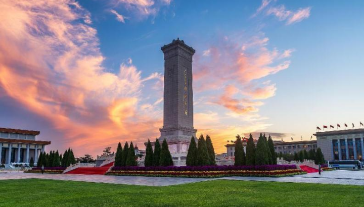 天安門(mén)廣場(chǎng),晚霞映襯下的人民英雄紀(jì)念碑