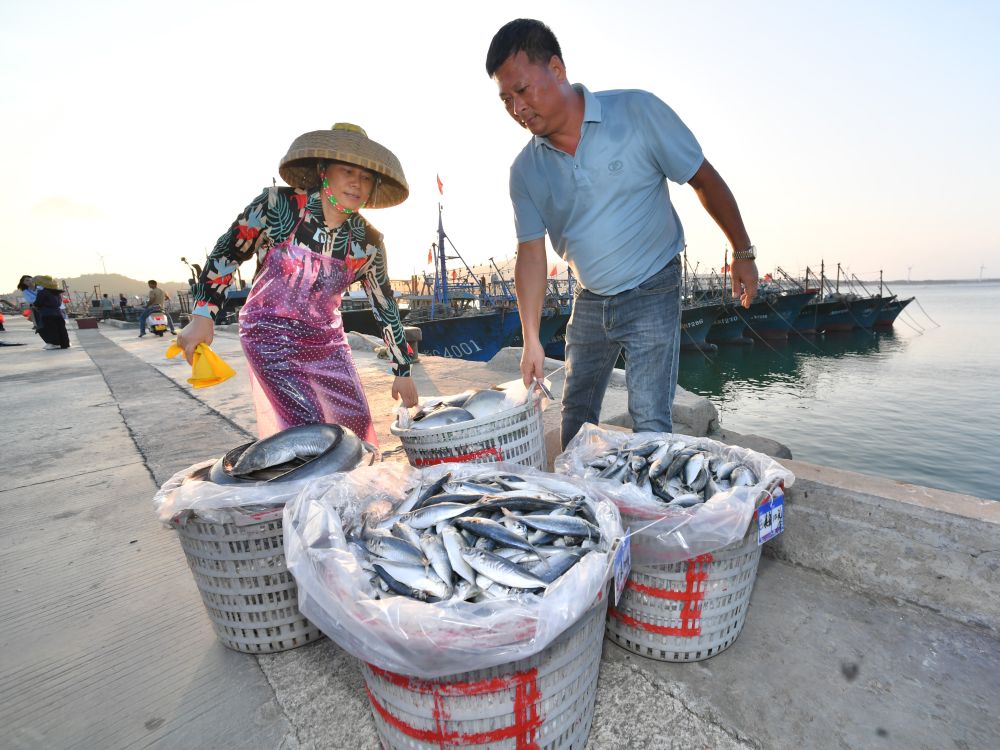 近日,澳角村村民在漁港碼頭上搬運海產(chǎn)品。新華社記者 姜克紅 攝