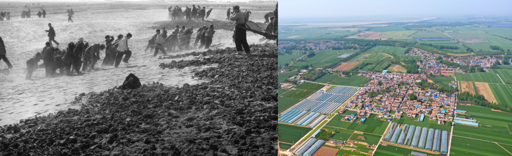 拼版照片:左圖為蘭考群眾在拉淤土壓沙(新華社記者 鄧歷耕 攝);右圖為2024年4月25日拍攝的蘭考縣張莊村(無人機(jī)照片,新華社記者 郝源 攝)。