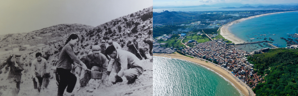 拼版照片:左圖為東山縣群眾在荒山上種植樹苗(資料照片);右圖為2020年6月18日拍攝的東山縣陳城鎮(zhèn)澳角村附近風(fēng)光(無人機(jī)照片,新華社記者 姜克紅 攝)。