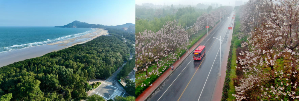 拼版照片:左圖為位于東山縣金鑾灣沿岸的木麻黃防護(hù)林帶(無人機(jī)照片,新華社記者 姜克紅 攝);右圖為2021年4月20日在蘭考縣焦裕祿干部學(xué)院附近拍攝的泡桐花(無人機(jī)照片,新華社記者 郝源 攝)。