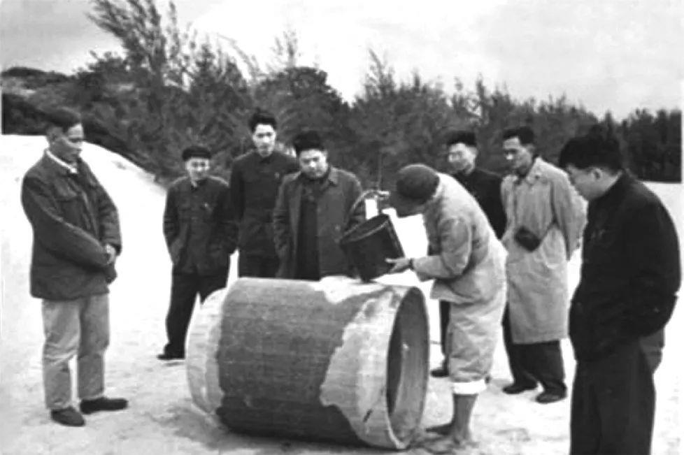 谷文昌在湖尾地下水工地與工程技術(shù)人員一起試驗(yàn)濾水管。