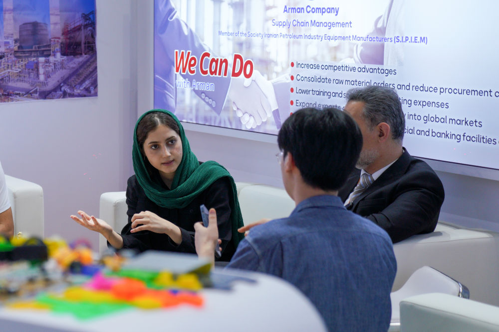 2024年9月15日,在位于北京的服貿(mào)會(huì)國家會(huì)議中心展區(qū),來自伊朗的參展商與中方參展人員交流。2024年一季度我國對(duì)伊朗市場(chǎng)采購出口同比增長(zhǎng)15.2%。